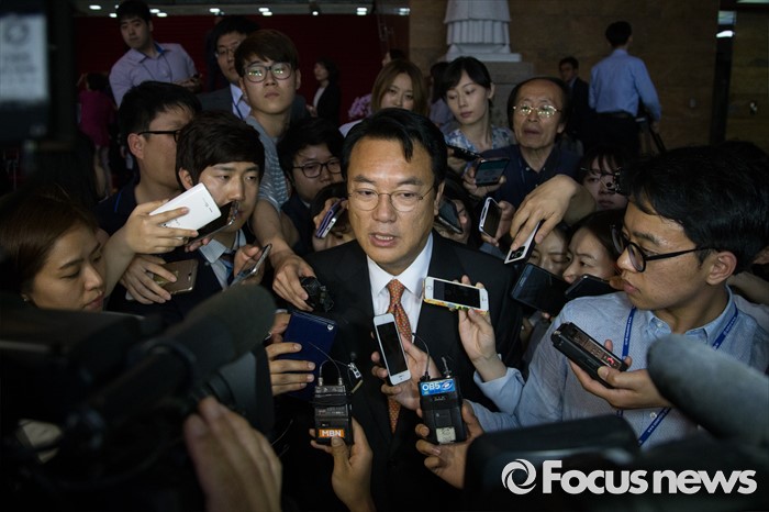 (서울=포커스뉴스) 정진석 새누리당 원내대표가 30일 오후 서울 여의도 국회에서 열린 의원총회를 마치고 국회를 나서던 중 취재진의 질문을 받고 있다.
