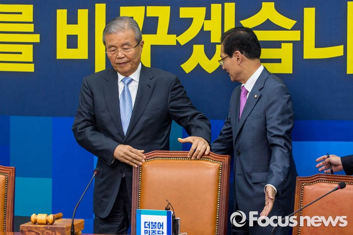 (서울=포커스뉴스) 김종인(왼쪽) 더불어민주당 비상대책위 대표와 오제세 전당준비위원장이 30일 오후 서울 여의도 국회에서 열린 '전당대회준비위원회 1차 회의'에 참석하기 위해 회의실로 들어서고 있다.