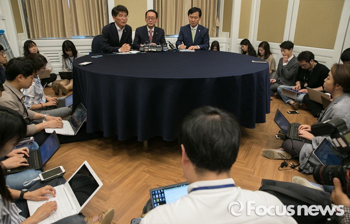 (서울=포커스뉴스) 30일 오후 서울 여의도 국회 귀빈식당에서 김도읍(가운데) 새누리당 원내수석부대표, 박완주(왼쪽) 더불어민주당 원내수석부대표, 김관영 국민의당 원내수석부대표가 20대 국회 원구상 협상 등을 위한 회동을 하고 있다.