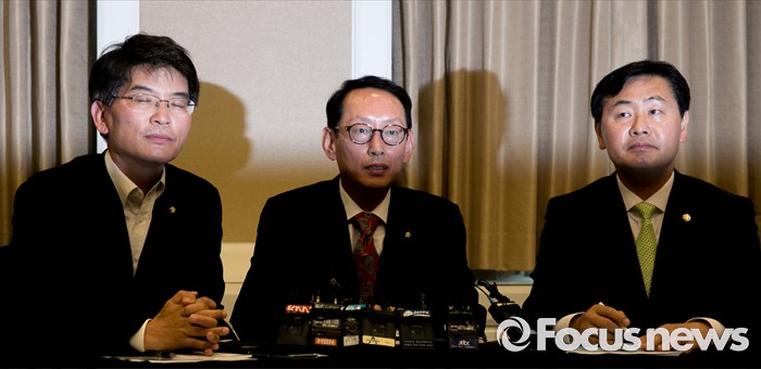 (서울=포커스뉴스) 30일 오후 서울 여의도 국회 귀빈식당에서 김도읍(가운데) 새누리당 원내수석부대표, 박완주(왼쪽) 더불어민주당 원내수석부대표, 김관영 국민의당 원내수석부대표가 20대 국회 원구상 협상 등을 위한 회동을 하고 있다.