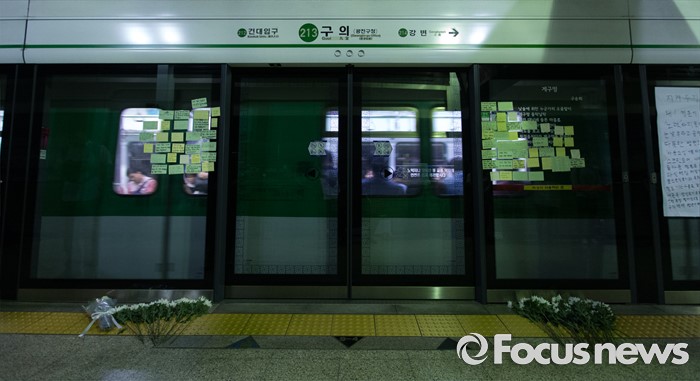 (서울=포커스뉴스) 30일 오후 서울 광진구 구의역 내 스크린도어 사망사고 발생 장소인 9-4 승강장에 쪽지와 국화가 놓여져 있다.
