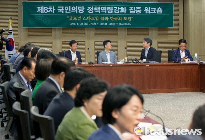 (서울=포커스뉴스) 31일 오전 서울 여의도 국회 의원회관에서 열린 국민의당 8차 정책역량강화 워크숍에 참석한 안철수(오른쪽 두번째) 상임공동대표와 강연자로 나선 임정욱(왼쪽 두번째) 스타트업얼라이언스 센터장이 대화하고 있다.