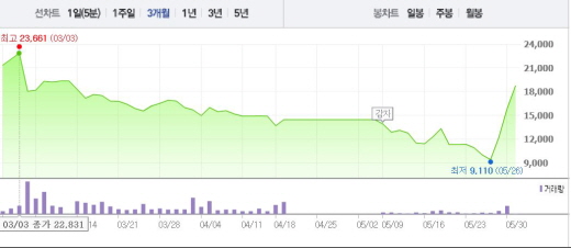현대상선은 용선료 협상이라는 산을 넘었지만 31일부터 1일까지 열리는 사채권자 집회에서 출자 전환과 채무 유예 등을 마무리해야 한다.주가흐름<사진출처=네이버 캡쳐>