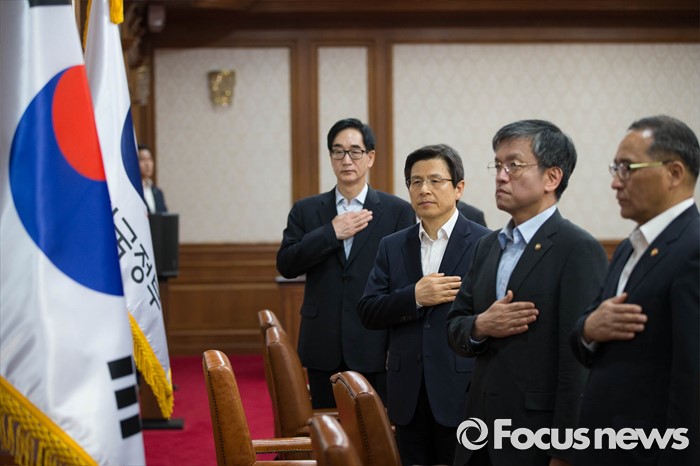 (서울=포커스뉴스) 31일 오전 서울 종로구 정부서울청사에서 열린 국무회의에 참석한 황교안(오른쪽 세 번째) 국무총리가 국민의례를 하고 있다.