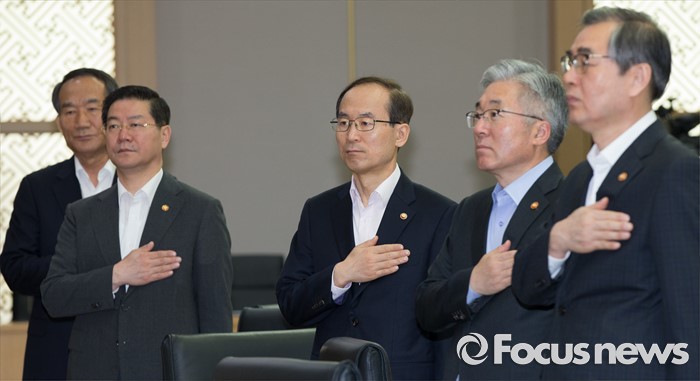 (세종=포커스뉴스) 31일 오전 세종시 정부세종청사 국무회의장에서 서울-세종 영상회의로 열린 국무회의에 참석한 국무위원들이 국기에 대한 경례를 하고 있다. 왼쪽부터 정재찬 공정거래위원장, 김종덕 문화체육관광부장관, 윤성규 환경부장관, 성영훈 국민권익위원장, 박승춘 국가보훈처장.