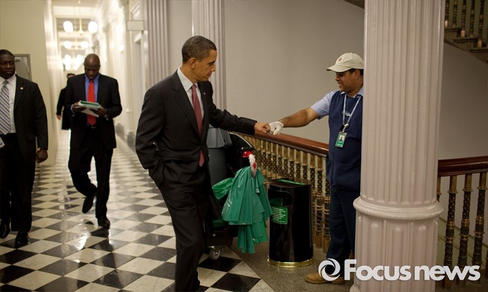 (서울=포커스뉴스) 백악관 아이젠하워 행정동 빌딩에서 오바마 대통령이 청소부 로렌스 립스컴과 주먹 인사를 하고 있다. <사진출처=백악관 공식홈페이지 갈무리>