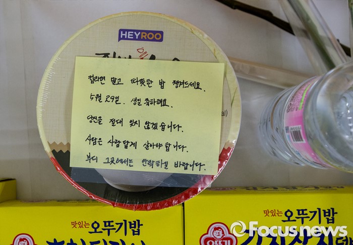 (서울=포커스뉴스) 31일 오전 서울 광진구 지하철 2호선 구의역에 마련된 스크린도어 사고 희생 청년 추모공간에 희생자를 위한 즉석밥과 추모의 글이 놓여 있다.