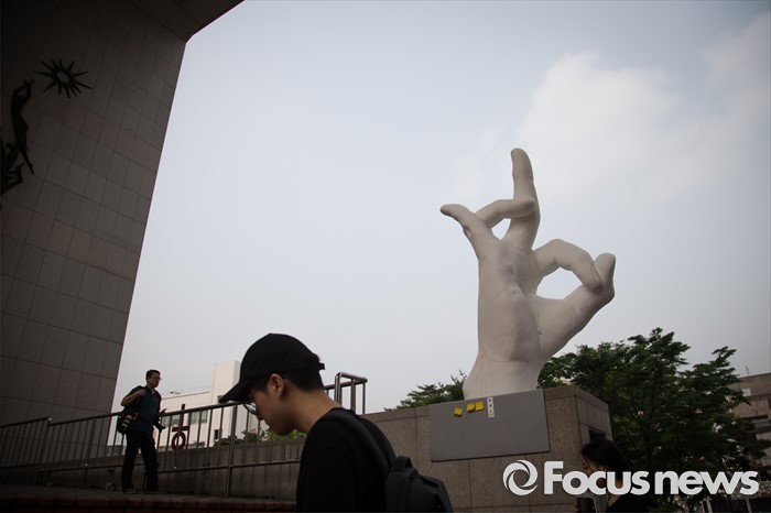 (서울=포커스뉴스) 31일 오전 서울 마포구 홍익대 정문 앞에 극우성향 사이트 '일베' 상징물 조각상이 설치되어 있다. 조각상은 일간베스트저장소를 상징하는 자음 'ㅇ'과 'ㅂ' 모양을 하며 회원을 인증하는 손 모양이다. 이 조각상은 조소과 4학년 홍기하씨가 '환경조각연구' 수업 과제로 제작되어 '환경조각연구 야외조각전에 출품한 것으로 '어디에나 있고, 아무데도 없다'는 제목을 붙였다.