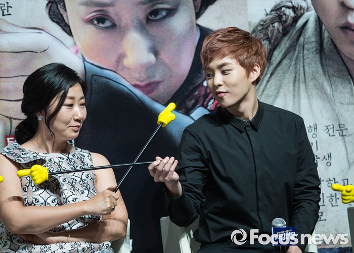 (서울=포커스뉴스) 31일 오전 서울 강남구 압구정CGV에서 열린 영화 '봉이 김선달' 제작보고회에 참석한 배우 라미란(왼쪽)과 시우민이 촬영현장내 인기투표를 하고 있다.