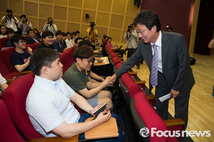 (서울=포커스뉴스) 유승민 무소속 의원이 31일 오후 서울 종로구 성균관대학교 법학관에서 열린 '경제위기와 정치의 역할' 강의 전 학생들과 인사하고 있다.