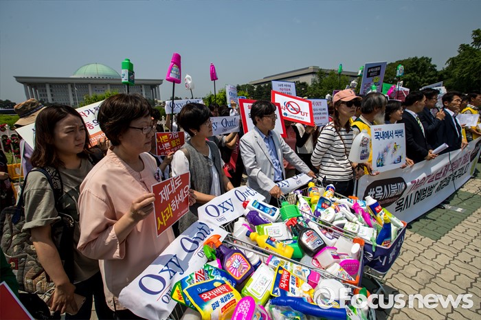 (서울=포커스뉴스) 31일 오후 서울 여의도 국회 앞에서 경제정의실천시민연합 관계자들이 옥시 제품 불매 및 옥시 예방법 제정을 촉구하는 기자회견을 하고 있다.