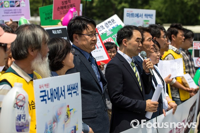 (서울=포커스뉴스) 31일 오후 서울 여의도 국회 앞에서 경제정의실천시민연합 관계자들이 옥시 제품 불매 및 옥시 예방법 제정을 촉구하는 기자회견을 하고 있다.