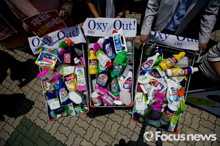 (서울=포커스뉴스) 31일 오후 서울 여의도 국회 앞에서 경제정의실천시민연합 관계자들이 옥시 제품 불매 및 옥시 예방법 제정을 촉구하는 기자회견을 하고 있다.