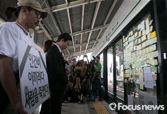 (서울=포커스뉴스) 31일 오후 서울 광진구 지하철 구의역에서 스크린도어 정비 작업 중 사고로 숨진 김모(19) 씨 사건 항의 기자회견을 마친 김 씨의 친구와 한국청년연대 등 청년단체들이 사건장소를 찾아 고인을 추모하고 있다.