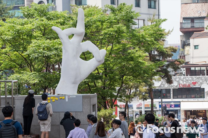 (서울=포커스뉴스) 31일 오후 서울 마포구 홍익대학교 정문에 극우성향 사이트 '일베' 상징물 조각상이 설치돼 있다. 조각상은 일간베스트저장소를 상징하는 자음 'ㅇ'과 'ㅂ' 모양을 하며 회원을 인증하는 손 모양이다. '어디에나 있고, 아무데도 없다'는 제목의 이 조각상은 조소과 4학년 홍기하씨가 '환경조각연구' 수업 과제로 제작해 야외조각전에 출품한 것이다.