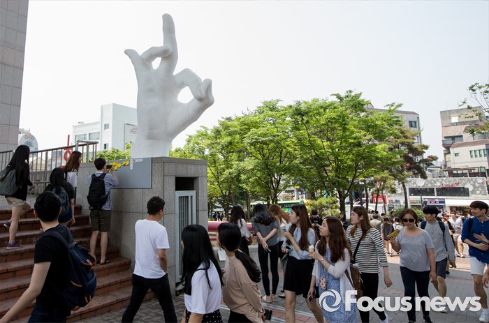 (서울=포커스뉴스) 31일 오후 서울 마포구 홍익대학교 정문에 극우성향 사이트 '일베' 상징물 조각상이 설치돼 있다. 조각상은 일간베스트저장소를 상징하는 자음 'ㅇ'과 'ㅂ' 모양을 하며 회원을 인증하는 손 모양이다. '어디에나 있고, 아무데도 없다'는 제목의 이 조각상은 조소과 4학년 홍기하씨가 '환경조각연구' 수업 과제로 제작해 야외조각전에 출품한 것이다.