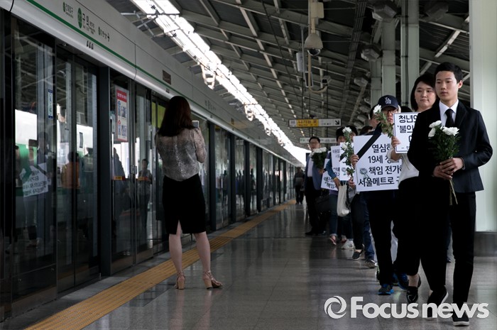 (서울=포커스뉴스) 31일 오후 서울 광진구 지하철 구의역에서 스크린도어 정비 작업 중 사고로 숨진 김모(19) 씨 사건 항의 기자회견을 마친 김 씨의 친구와 한국청년연대 등 청년단체들이 고인을 추모하기 위해 사건장소로 향하고 있다.