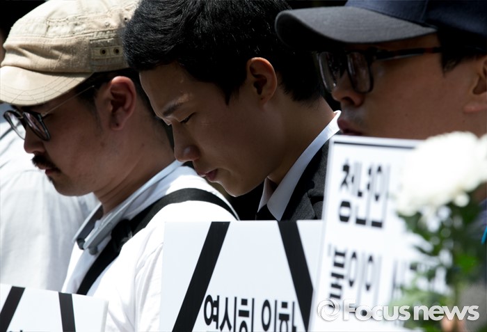 (서울=포커스뉴스) 31일 오후 서울 광진구 지하철 구의역 앞에서 한국청년연대 등 청년단체 주최로 열린 스크린도어 정비 작업 중 사고로 숨진 김모(19) 씨 사건 항의 기자회견에 참석한 김 씨의 친구(가운데)가 슬픔에 잠겨 있다.