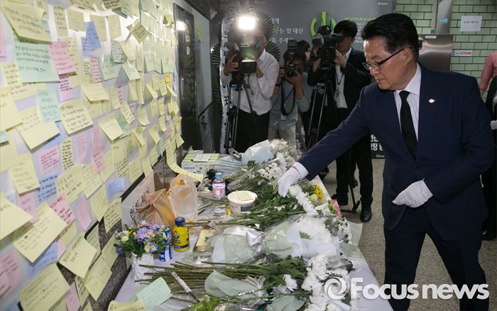 (서울=포커스뉴스) 박지원 국민의당 원내대표 등 의원들이 31일 오후 서울 광진구 지하철 구의역 역사 내에 마련된 스크린도어 정비 작업 중 사고로 숨진 김모(19) 씨의 추모공간을 방문해 헌화 및 묵념을 하고 있다.