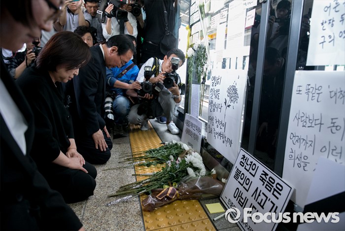 (서울=포커스뉴스) 심상정 정의당 상임대표와 노회찬 원내대표 등 의원들이 31일 오후 서울 광진구 지하철 구의역에서 스크린도어 정비 작업 중 사고로 숨진 김모(19) 씨의 사건장소를 방문해 고인을 추모하고 있다.