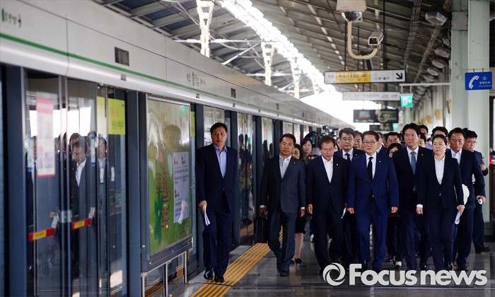 (서울=포커스뉴스) 박지원 국민의당 원내대표 등 의원들이 31일 오후 서울 광진구 지하철 구의역에서 스크린도어 정비 작업 중 사고로 숨진 김모(19) 씨의 사건장소를 방문해 고인을 추모하기 위해 이동하고 있다.