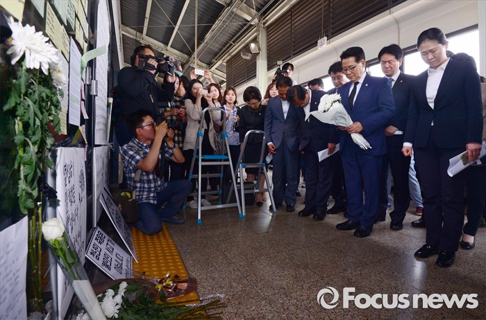(서울=포커스뉴스) 박지원 국민의당 원내대표 등 의원들이 31일 오후 서울 광진구 지하철 구의역에서 스크린도어 정비 작업 중 사고로 숨진 김모(19) 씨의 사건장소를 방문해 고인을 추모하고 있다.