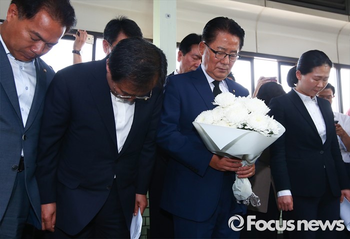 (서울=포커스뉴스) 박지원 국민의당 원내대표 등 의원들이 31일 오후 서울 광진구 지하철 구의역에서 스크린도어 정비 작업 중 사고로 숨진 김모(19) 씨의 사건장소를 방문해 고인을 추모하고 있다.