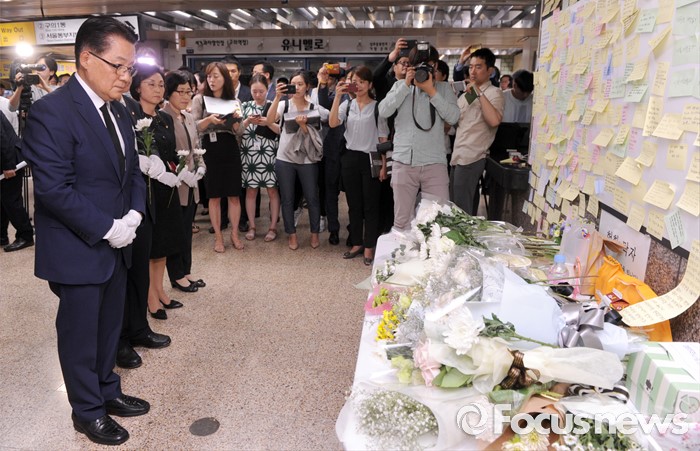 (서울=포커스뉴스) 박지원 국민의당 원내대표 등 의원들이 31일 오후 서울 광진구 지하철 구의역에서 스크린도어 정비 작업 중 사고로 숨진 김모(19) 씨의 추모공간을 방문해 헌화한 뒤 묵념을 하고 있다.
