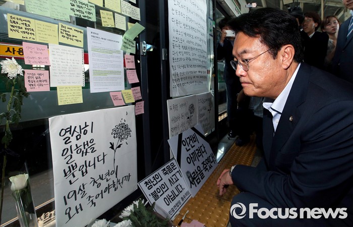 구의역 스크린도어 사고현장 찾아 추모하는 정진석