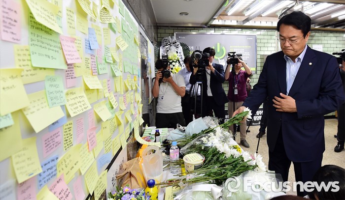 (서울=포커스뉴스) 정진석 새누리당 원내대표가 31일 오후 서울 광진구 지하철 구의역에서 스크린도어 정비 작업 중 사고로 숨진 김모(19) 씨의 추모공간을 방문해 헌화하고 있다.
