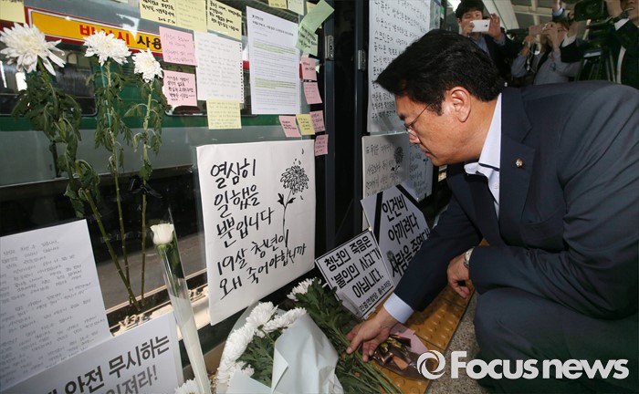 한편 지난 28일 오후 5시57분쯤 서울지하철 2호선 강변역 방향으로 가는 구의역에서 정비용역업체 직원 김군이 작업을 하다 숨지는 사고가 발생했다.정진석 새누리당 원내대표가 31일 오후 서울 광진구 지하철 구의역에서 스크린도어 정비 작업 중 사고로 숨진 김모(19) 씨의 사건장소를 방문해 고인을 추모하고 있다. 2016.05.31 박동욱 기자 (서울=포커스뉴스) 박지원 국민의당 원내대표 등 의원들이 31일 오후 서울 광진구 지하철 구의역에서 스크린도어 정비 작업 중 사고로 숨진 김모(19) 씨의 사건장소를 방문해 고인을 추모하고 있다. 2016.05.31 박동욱 기자 김종인 더불어민주당 비대위 대표가 31일 오후 서울 광진구 지하철 구의역에서 스크린도어 정비 작업 중 사고로 숨진 김모(19) 씨의 사건장소를 방문해 추모의 메모를 남겼다. 사진은 김 대표가 남긴 추모 메모. 2016.05.31 박동욱 기자 31일 오후 서울 광진구 지하철 구의역에서 스크린도어 정비 작업 중 사고로 숨진 김모(19) 씨 사건 항의 기자회견을 마친 김 씨의 친구와 한국청년연대 등 청년단체들이 사건장소를 찾아 고인을 추모하고 있다. 2016.05.31 박동욱 기자