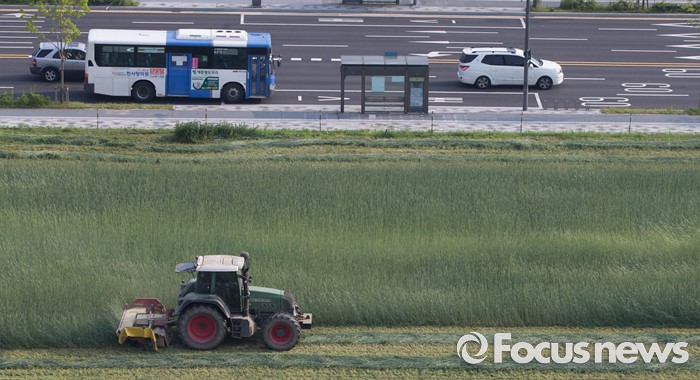 (세종=포커스뉴스) 31일 오후 세종시 정부세종청사 인근 한국토지주택공사 부지에 심은 호밀을 수확하고 있다.