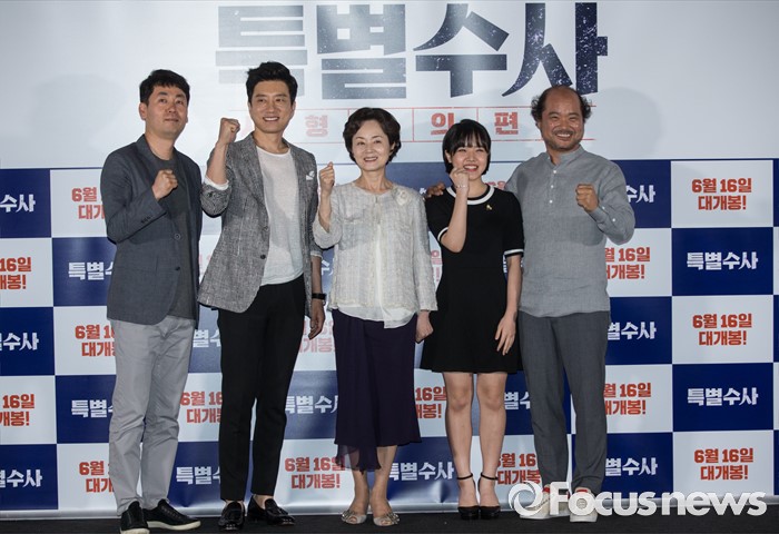 (서울=포커스뉴스) 31일 오후 서울 성동구 왕십리 CGV에서 열린 영화 ' 특별수사 : 사형수의 편지' 언론시사회에 참석한 권종관(왼쪽부터) 감독과 배우 김명민, 김영애, 김향기, 김상호가 포토타임을 갖고 있다.