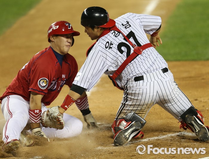 (서울=포커스뉴스) 31일 서울 잠실구장에서 열린 2016 프로야구 KIA-LG 경기 6회초 1사 1,3루에서 KIA 강한울의 1루땅볼때 3루주자 이홍구가 홈으로 뛰어들다 태그아웃되고 있다.