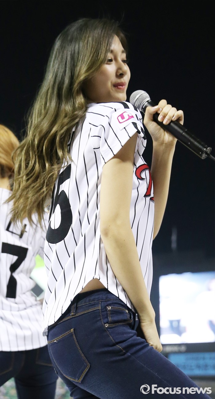 (서울=포커스뉴스) 31일 서울 잠실구장에서 열린 2016 프로야구 KIA-LG 경기에 인기 걸그룹 트와이스가 시구, 시타로 참여한뒤 경기 중간 응원단상에 올라 관중에게 노래와 춤을 선사하고 있다.