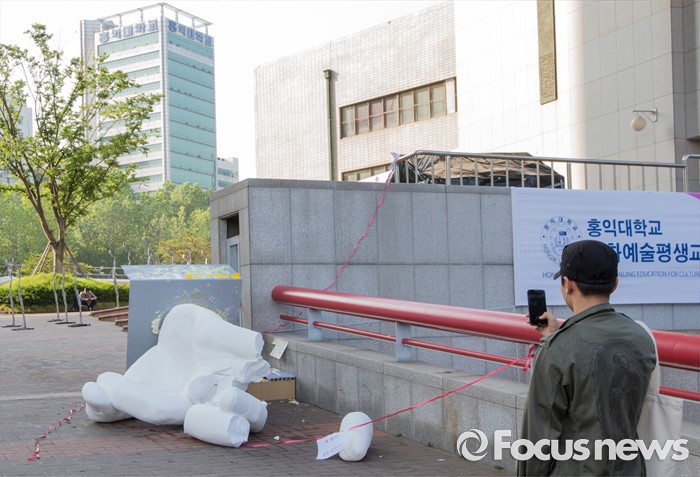 (서울=포커스뉴스) 1일 오전 서울 마포구 홍익대학교 정문에 설치된 극우성향 사이트 '일베' 상징물 조각상 파손된 채 길에 방치돼 있다. 조각상은 일간베스트저장소를 상징하는 자음 'ㅇ'과 'ㅂ' 모양을 하며 회원을 인증하는 손 모양이다. '어디에나 있고, 아무데도 없다'는 제목의 이 조각상은 조소과 4학년 홍기하씨가 '환경조각연구' 수업 과제로 제작해 야외조각전에 출품한 것이다.