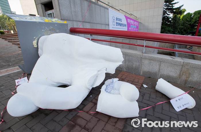 (서울=포커스뉴스) 1일 오전 서울 마포구 홍익대학교 정문에 설치된 극우성향 사이트 '일베' 상징물 조각상 파손된 채 길에 방치돼 있다. 조각상은 일간베스트저장소를 상징하는 자음 'ㅇ'과 'ㅂ' 모양을 하며 회원을 인증하는 손 모양이다. '어디에나 있고, 아무데도 없다'는 제목의 이 조각상은 조소과 4학년 홍기하씨가 '환경조각연구' 수업 과제로 제작해 야외조각전에 출품한 것이다.