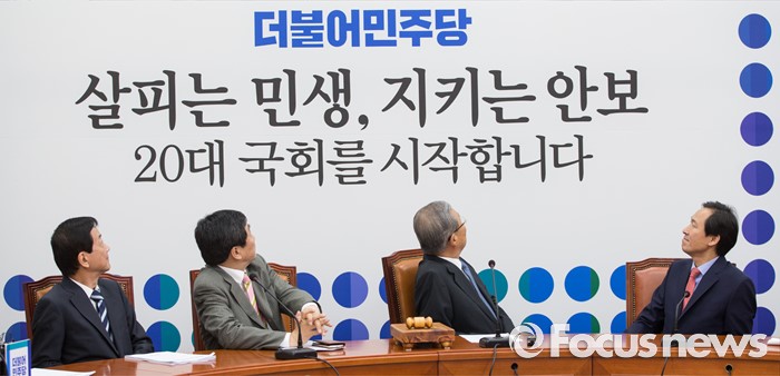 (서울=포커스뉴스) 김종인 더불어민주당 비상대책위 대표와 우상호 원내대표가 1일 오전 국회에서 열린 비상대책위원회 회의에 참석해 비상대책위원들과 함께 20대 국회 개원에 발 맞춰 만든 배경판을 바라보고 있다. 회의실 배경판에는 '살피는 민생, 지키는 안보 20대 국회를 시작합니다'라는 글이 새겨져 있다.