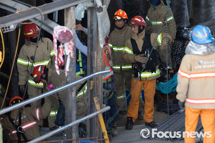 (남양주=포커스뉴스) 1일 오전 7시 20분께 경기 남양주시 진전읍 금곡리 진접석 지하철 공사현장이 붕괴되는 사고가 발생해 소방대원들이 구조작업을 하고 있다.