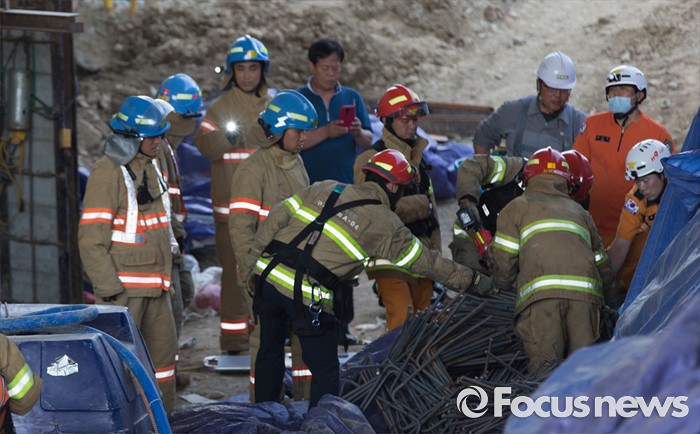 (남양주=포커스뉴스) 1일 오전 7시 20분께 경기 남양주시 진전읍 금곡리 진접석 지하철 공사현장이 붕괴되는 사고가 발생해 소방대원들이 구조작업을 하고 있다.