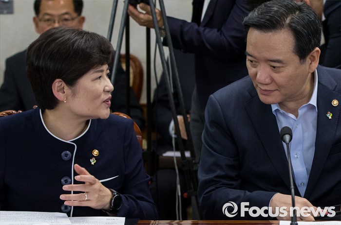 (서울=포커스뉴스) 1일 오전 서울 종로구 정부서울청사에서 열린 법질서관계장관회의에 참석한 강은희(왼쪽) 여상가족부 장관과 김현웅 법무부 장관이 대화하고 있다.