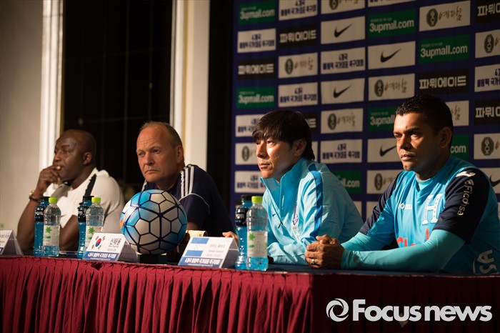 (인천=포커스뉴스) 1일 오전 인천 연수구 라마다송도호텔에서 열린 4개국 올림픽 국가대표 축구대회 공식 기자회견에서 참가국 감독과 수석코치가 취재진 질문에 답하고 있다. 왼쪽부터 삼손 시아시아 나이지리아 감독, 닐스 프레드닉센 덴마크 감독, 신태용 대한민국 감독, 아마도 궤바라 온두라스 수석코치.