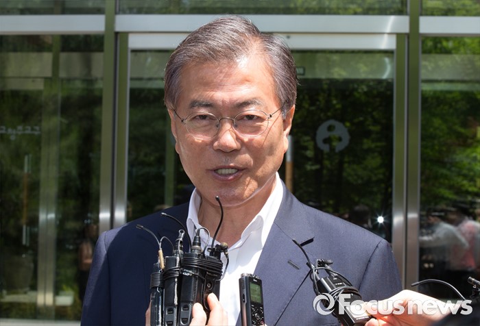 (청주=포커스뉴스) 문재인 더불어민주당 전 대표가 1일 오전 충북 청주 청원구 천주교 청주교구를 방문, 장봉훈 주교와 면담을 마치고 청주교구를 나서며 취재진의 질문에 답변하고 있다.