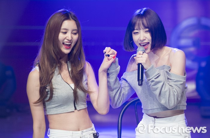 (서울=포커스뉴스) 1일 오전 서울 강남구 일지아트홀에서 열린 걸그룹 EXID의 정규 1집앨범 'STREET' 발표 쇼케이스에 참석한 멤버 정화(왼쪽)와 하니가 무대를 선보이고 있다.