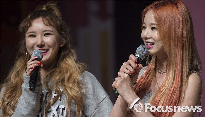 (서울=포커스뉴스) 1일 오전 서울 강남구 일지아트홀에서 열린 걸그룹 EXID의 정규 1집앨범 'STREET' 발표 쇼케이스에 참석한 멤버 솔지(오른쪽)이 인사말을 하고 있다. 왼쪽부터 LE, 솔지.