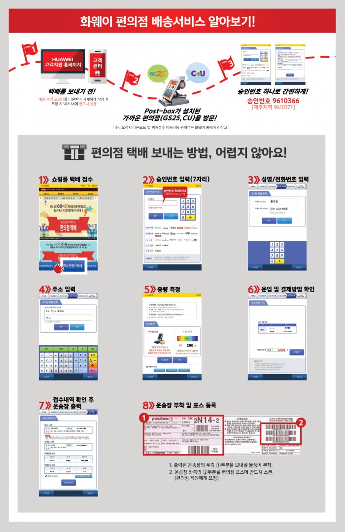 편의점을 방문한 고객은 포스트 박스에 택배 접수를 누른 후 화웨이 홈페이지에 안내돼 있는 승인번호 7자리를 입력하고 배송 받을 주소 및 기타 정보를 입력하면 운송장을 출력할 수 있다. 승인번호는 '9610366'이며 제주지역의 경우 '9610377'이다. 운송장을 부착한 박스를 편의점 직원에게 전달해 바코드 스캔을 받으면 편의점 배송 서비스 신청 절차를 간단하게 마무리할 수 있다.