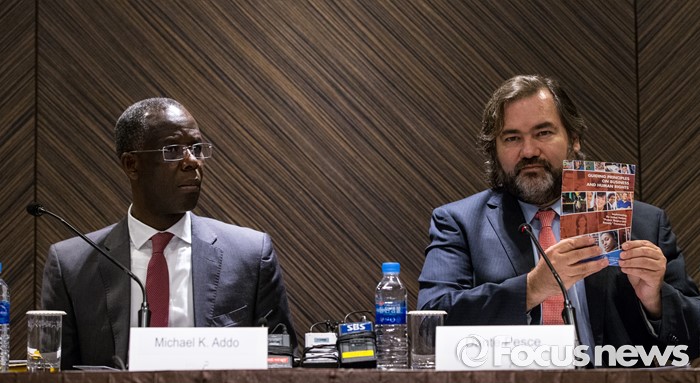 (서울=포커스뉴스) 1일 오후 서울 중구 플라자호텔에서 열린 '유엔인권이사회, 기업과인권 한국조사단 기자회견'에서 단테 페스케(오른쪽) 의장이 한국 기업 인권 조사 결과 발표에 앞서 UN 인권 지침서를 보이고 있다.