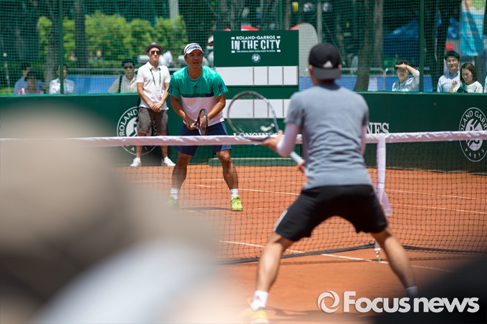 (서울=포커스뉴스) 이형택 전 테니스 국가대표가 1일 오후 서울 중구 서울광장에서 열린 '롤랑가로스(프랑스오픈) 인더시티'에서 대학생들과 스페셜 매치 시합을 하고 있다.