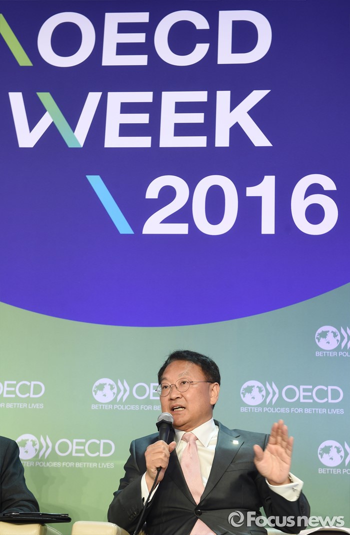 (서울=포커스뉴스) 유일호 부총리 겸 기획재정부 장관이 1일 프랑스 파리 OECD에서 열린 '2016년 OECD 각료이사회'에 참석, 고위급 패널토론에서 주제인 '성장을 위한 새로운 과제'와 관련 토론하고 있다. <사진제공=기획재정부>