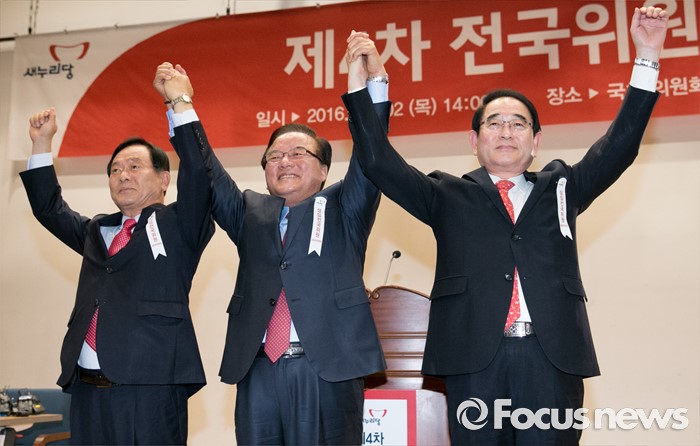 (서울=포커스뉴스) 2일 오후 서울 여의도 국회 의원회관에서 열린 새누리당 4차 전국위원회에 참석한 정갑윤(가운데) 신임 전국위의장과 박명재(오른쪽), 전희재 부의장이 손을 들어 인사하고 있다.